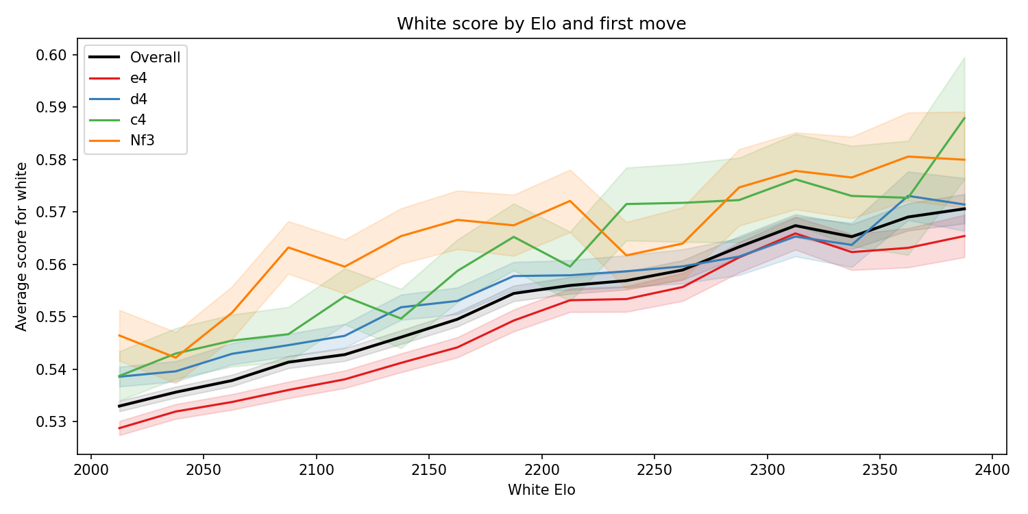 Using these proportions for weighted averages of the winrates for players at different Elos means we’d expect 51% winrate for e4, and 51.33% for Nf3.