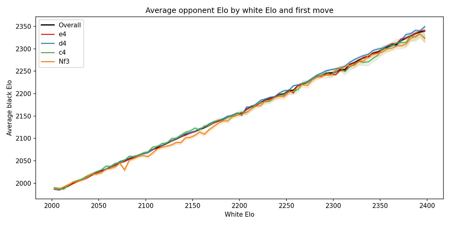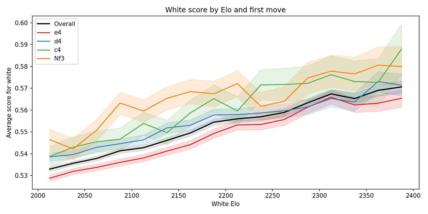 And regarding Nf3 vs e4, we know that there’s something going on that is not explained by how strong the players are, and we know how big it is. But the key question that remains is, what about Nf3 makes it score better?